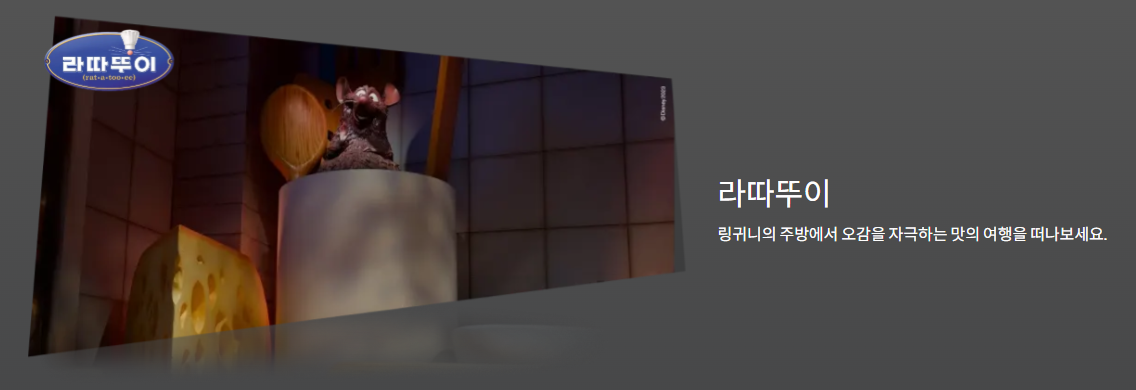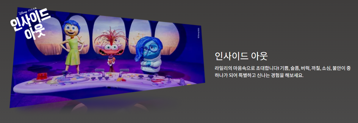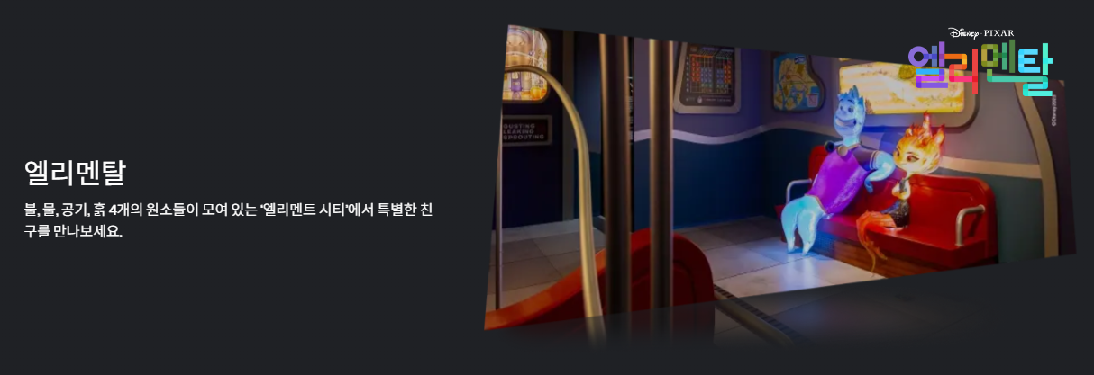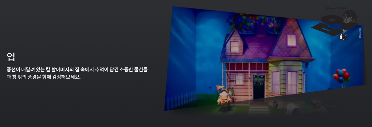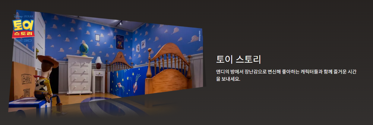 - 대형 몰입형 공간: 1,000평(3,300㎡) 규모의 공간에 토이 스토리, 몬스터 주식회사, 업, 코코, 인사이드 아웃, 엘리멘탈 등 픽사의 대표작 속 공간을 실물 크기 세트와 조형물로 완벽 재현.