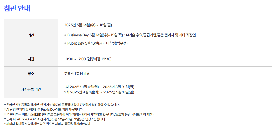 사전등록 명단을 바탕으로 비즈니스 매칭, 1:1 상담 등 다양한 네트워킹 프로그램에 우선적으로 참여할 수 있습니다. AI 업계 종사자, 취업 준비생, 스타트업 관계자라면 꼭 사전등록을 추천드려요!
