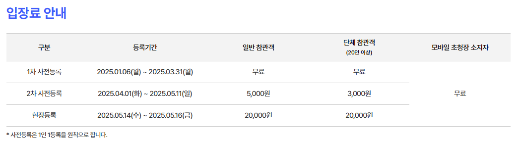 현장 등록 시 입장료가 20,000원이지만, 사전등록하면 무료 또는 할인 혜택을 받을 수 있습니다. 미리 등록만 해도 비용 부담 없이 전시회를 관람할 수 있어요!