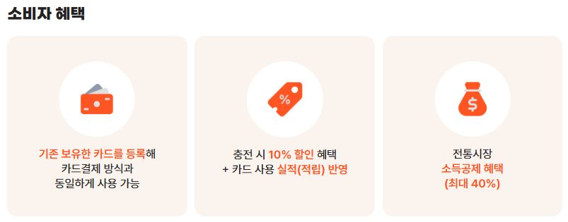 - 10% 할인된 가격으로 충전 (예: 10만원권 → 9만원 결제) - 전통시장 등 가맹점에서 결제