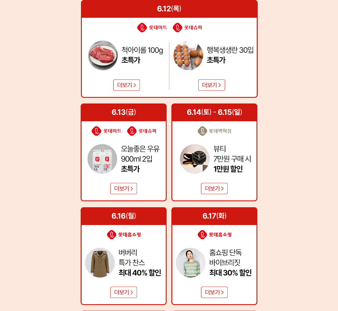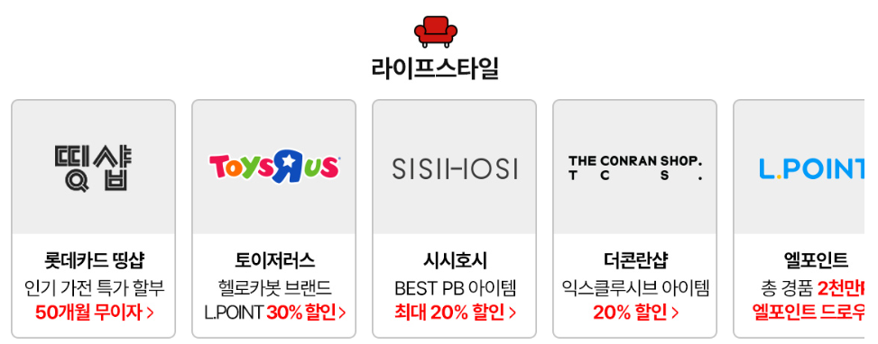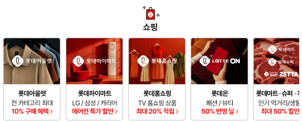 백화점, 마트, 하이마트 등 전국 매장에서 다양한 오프라인 이벤트와 특가 상품을 만나보세요. - 롯데온, 롯데홈쇼핑 등 온라인몰 이용