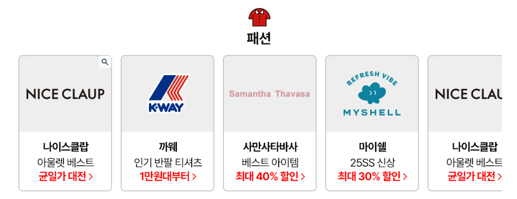 - 패션/리빙/뷰티 등 다양한 브랜드별 할인