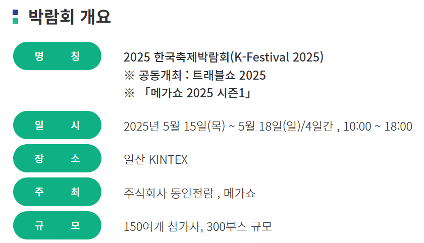 한국축제박람회는 전국 각지의 대표 축제와 지역 특산, 관광 콘텐츠를 한자리에서 만날 수 있는 국내 최대 규모의 축제 전문 박람회입니다. 각 지역의 지자체와 축제, 여행업계가 대거 참여해 다양한 볼거리와 즐길 거리를 제공합니다. 특히 올해는 트래블쇼 2025와 공동 개최되어, 여행과 축제를 한 번에 체험할 수 있는 절호의 기회입니다.